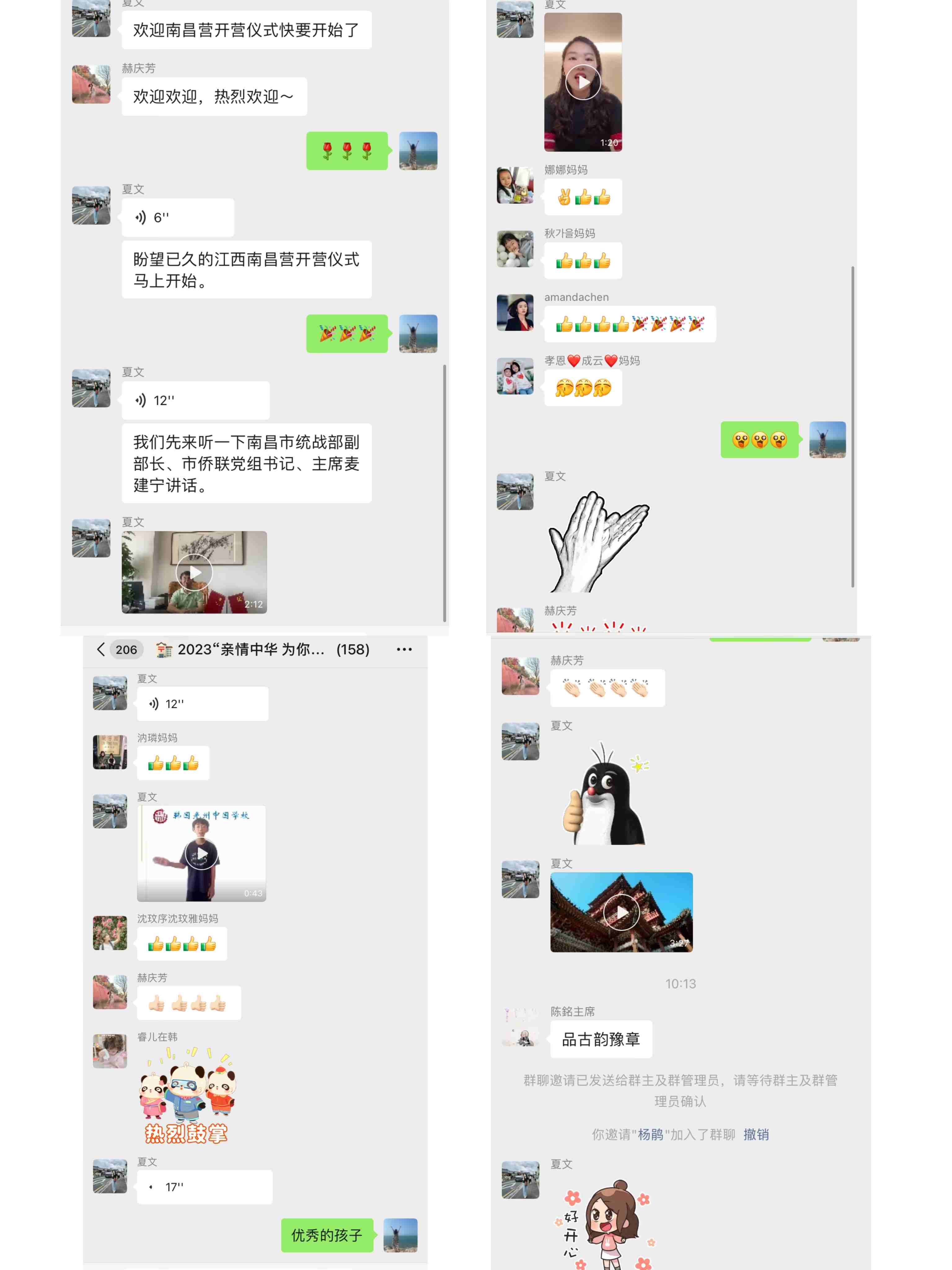 韩国大邱庆北华侨华人联合会会长、中国传统文化艺术学院院长肖娟表示,南昌是一个拥有2200多年深厚历史文化底蕴的地方,素有“物华天宝、人杰地灵”的美誉,也是中国革命的诞生地。感谢江西省侨联和南昌市侨联为海外华裔青少年提供了一个宝贵的学习机会,希望学生们通过此次江西南昌特色网上营的学习,对南昌有一个详细的了解,了解中国近代的革命发展史,更知道人民对幸福生活的珍惜。今后我们也希望能够亲临南昌这片热土,亲身感受南昌的地域文化的魅力。预祝2023“亲情中华·美丽江西”江西南昌特色营取得圆满成功。