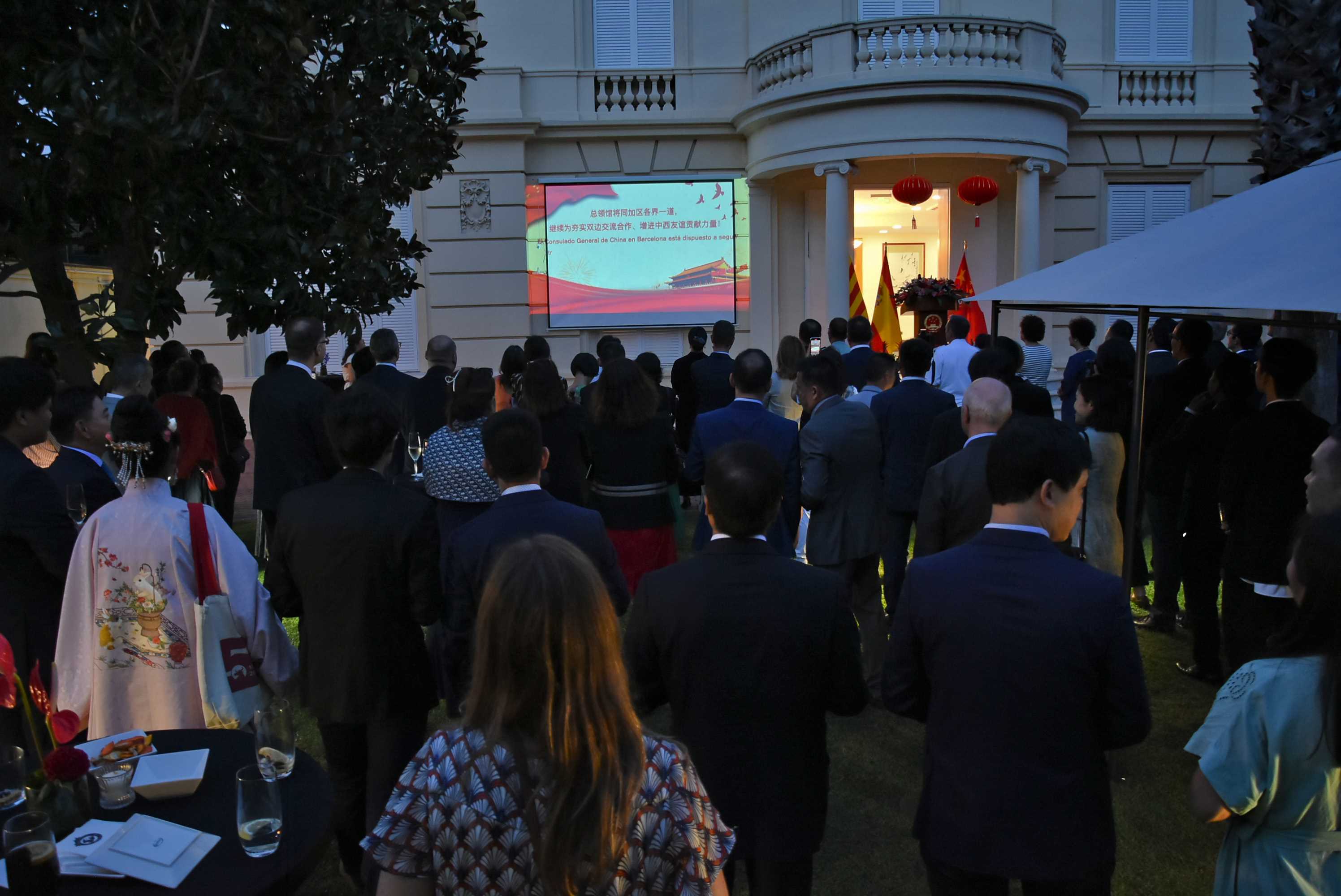 9月27日下午七点,中国驻巴塞罗那总领馆内张灯结彩,高朋满座,“庆祝中华人民共和国成立七十四周年招待会”即将开始,胡爱民代总领事和领事们在门口热情迎接到访的中外嘉宾。应邀出席的嘉宾有,中央驻加区副代表Josefa Beltran女士,巴塞罗那市政府国际关系与城市推广专员Pau Solanilla先生,中央驻塔拉戈纳副代表castella先生,中央驻加区国防代表Jose Baron先生,加区企业厅长Roger Torret先生,加区议员David Perez先生等当地政府工商界友人以及华侨华人、留学生、专家学者、中资机构代表等200余人出席了是晚的招待会。招待会由于筱芳主任主持。招待会开始时,首先分别奏响了西班牙国歌和中国国歌。