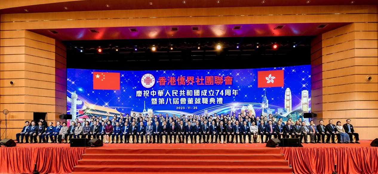 香港侨界社团联会庆祝中华人民共和国成立74周年暨第八届会董会就职典礼于25日晚在香港会展中心举行。全国政协副主席梁振英,香港特别行政区行政长官李家超,中共中央统战部副部长林锐,中国侨联副主席程学源,中央政府驻港联络办公室副主任尹宗华,中央政府驻港维护国家安全公署副署长孙青野,外交部驻港特派员公署署理特派员李永胜,中国侨联副主席、香港侨界社团联会首席主席余国春,中国侨联副主席、香港侨界社团联会主席吴换炎等共同主礼,香港侨界及香港社会各界人士千余人出席典礼。