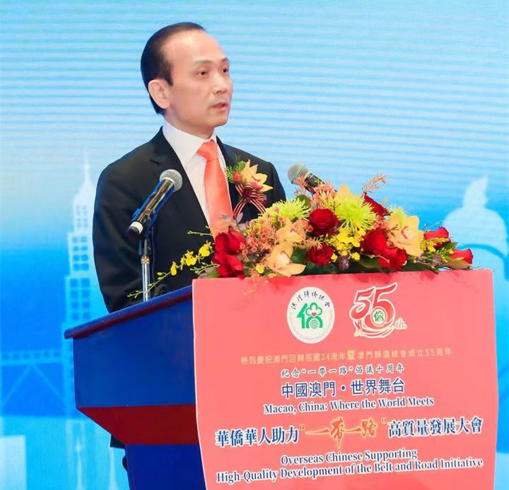 贺一诚表示,长期以来,澳门归侨总会等澳门侨界社团发挥“融通内外”的独特优势,全力支持特区政府施政,积极参与社会事务,立足澳门放眼世界,促进海内外华侨华人助力“一带一路”建设,为特区长期繁荣稳定作出了积极贡献。希望澳门归侨总会等侨(社)团和广大澳门侨界同胞不忘初心,守正创新,继续弘扬爱国爱澳的核心价值,加强与海内外侨胞联系,助力澳门进一步发挥海上丝绸之路节点的作用,扩大与“一带一路”共建国家和地区的交流合作,为澳门特区长期繁荣稳定贡献更大力量!