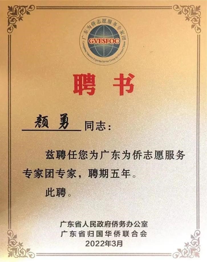 颜勇受聘广东为侨志愿服务专家团专家成员