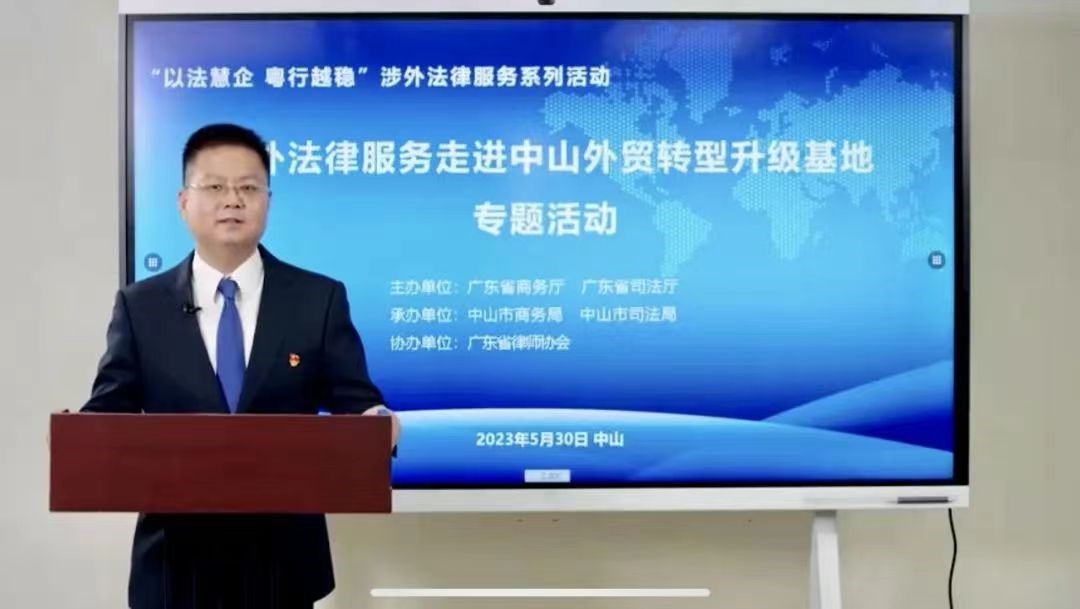 2023年5月,广东省商务厅、广东省司法厅在中山市联合主办“涉外法律服务走进中山外贸转型升级基地专题活动”。颜勇作为律师代表参加上述活动,为中山市的侨胞和侨资企业作海外经营合规专题分享,让更多的侨胞侨企明确企业“走出去”“引进来”过程中合规经营的重要性。
