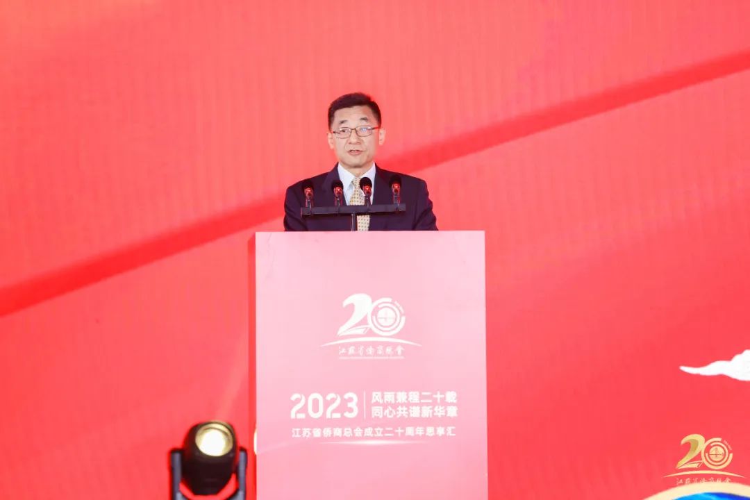江苏省侨联党组书记、主席刘标说,二十年来,一批批在苏侨商精诚团结、砥砺前行、勇担责任、超越梦想,省侨商总会始终坚持汇聚侨资侨智侨力服务中心大局,已成为凝聚全省侨商、弘扬侨商精神、传承侨商文化、贡献江苏发展的响亮平台。他强调商会发展离不开省委省政府的关心关怀,商会取得的成就得益于省委省政府对侨商总会建设工作和侨界企业发展的指导帮助,希望侨界企业家厚植爱国情怀、激发奋进力量,在实现中华民族伟大复兴中国梦的新征程上奋勇前行。抢抓发展机遇、彰显侨界担当,在奋力推进中国式现代化江苏新实践中走在前做示范。汇聚侨心侨力、当好桥梁纽带,为谱写“强富美高”新江苏现代化建设新篇章汇聚力量。