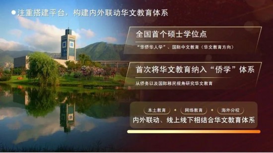 自1999年开始,温州大学就注重搭建支撑海外华文教育的平台,构建内外联动的华文教育体系。温州大学以创建侨特色“省部共建”高校为发展目标,师范教育与华侨教育办学特色显著,华文教育基础扎实。学校侨教育积淀深厚、侨研究实力雄厚、侨文化氛围浓厚,建有实体二级学院——华侨学院,设有浙江华侨网络学院、意大利分校、侨文化展示馆、华文师资志愿者培养基地、中国剪纸艺术分会等多元平台。温州大学设有全国首个“华侨华人学”交叉学科硕士学位点,拥有国际中文教育(华文教育方向)硕士学位点,并首次将华文教育纳入“侨学”体系,从侨务以及国际移民视角研究华文教育,形成了“本土教育+网络教育+海外分校”三位一体的内外联动、线上线下相结合的华文教育全方位生态体系。学校打造了多个华文教育交流品牌,举办了3届欧洲华文教育学术研讨会、2届华侨华人发展与侨务工作研讨会、6届世界温州人研究国际学术研讨会、30期中国华侨华人研究学术工作坊和华文教育国别研讨会;举办21届海外华裔青少年“中国寻根之旅”夏令营,10期海外华文教师研习班,国别华文教育成果展、编写教材2套,构建了“幼儿园+小学+中学+大学一体化”的为侨服务全生命周期华文教育体系。