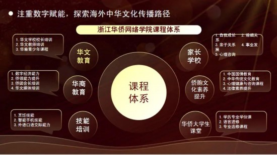 温州大学注重数字赋能,不断探索海外中华文化传播新路径。学校率全国之先,设立“云端华校”,开展守望相助“快乐汉语 亲子共学”系列线上华文教育课程,形成“家长+教师+学生”三位一体的教育体系。2020年7月,在浙江省侨办、浙江省侨联与温州大学共同筹建下,浙江华侨网络学院正式挂牌成立,由温州大学华侨学院负责具体实施。浙江网络学院设有华文教育、华商教育、技能培训、家长学校、侨胞文化素养提升和华侨大学生课堂等六大板块课程,开设云端课程280余门、线上文化活动1580余场次、注册学员达4万余人、服务海外华侨华人300多万人次,为海外华校做好嵌入式课程补充。相关成果被学习强国、人民日报、中新社等40多家主流媒体进行了共计65.3万条深度报道。