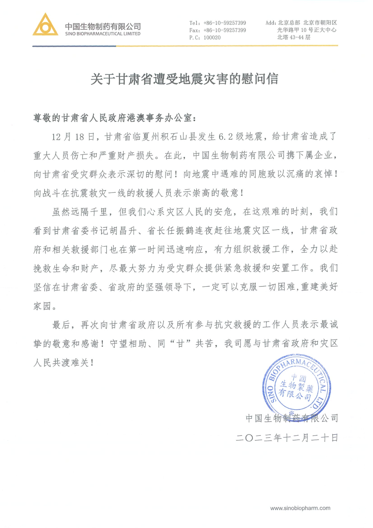 12月18日,甘肃临夏州积石山县发生6.2级地震,至今已致一百余人遇难,受灾群众达14万余人。为满足灾区人民的急迫需求,中国生物制药第一时间响应国家号召,组织各成员企业发起紧急救援行动,共同向灾区捐赠价值550万元人民币的药品和食品,包括抗感染、镇痛以及术后营养补充等在医疗救治过程中的常用药物和适合野外食用的方便食品,充分体现了医药企业的责任与担当。据悉,中国生物制药及下属企业捐赠的药品与食品,将通过甘肃省人民政府港澳事务办公室转往积石山县医院,用于伤员救治和分发给有需要的群众。