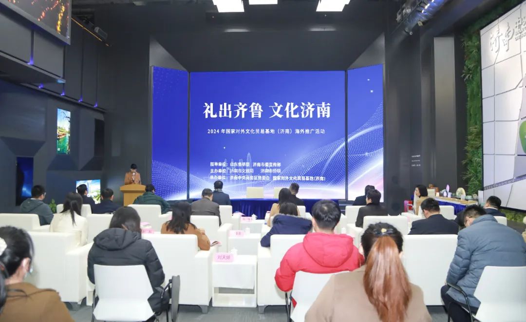 为贯彻落实党的二十大报告关于“增强中华文明传播力影响力”的部署要求,充分发挥国家对外文化贸易基地(济南)、华侨国际文化交流基地作用,弘扬齐鲁文化,提升齐鲁文化海外传播力,1月14日,“礼出齐鲁 文化济南”2024年国家对外文化贸易基地(济南)海外推广活动举办。山东省侨联党组成员、副主席卢文朋,济南市委宣传部分管日常工作的副部长、济南市文明办主任孙世会,北京大学文化产业研究院院长、国家文化产业创新与发展研究基地副主任向勇,济南市文化和旅游局党组书记、局长马利,济南市侨联党组书记、主席米文芃,济南中央商务区管委会主任王海清出席活动。
