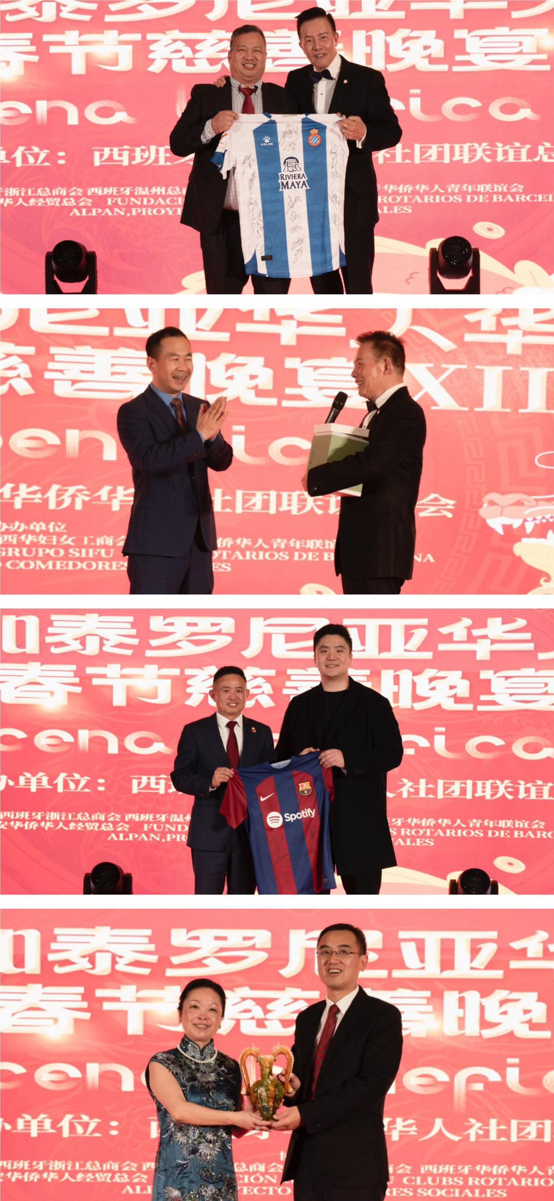 晚宴开启前的嘉宾致词环节,社团联谊总会慈善执行主席陈菲菲女士首先登台作慈善报告。12年前的龙年,我们举办了受届加泰罗尼亚华人华侨春节慈善晚宴。当时正值全球经济危机,我们通过做实事,做善事,传递中华民族“乐善好施”的“扶危济困”慈善精神,获得社会共识共鸣,受到社会爱戴与支持。12年的点点滴滴历历在目,感谢历届驻巴塞罗那总领馆、西班牙中央政府、加泰罗尼亚大区政府,及社团与企业等赞助单位,以及兄弟侨团历年来对新春慈善晚宴的大力支持。希望12年后,我们会感谢今天的付出和努力,犹如今天的我们,感谢12年前的我们曾付出的行动。