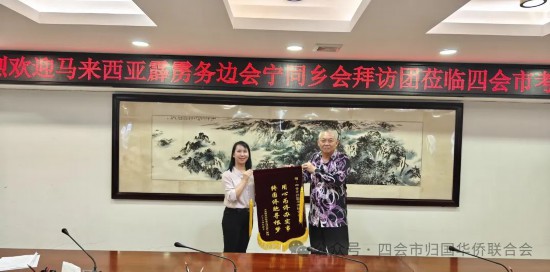 马来西亚侨胞吴某强(右)向市侨联赠送锦旗