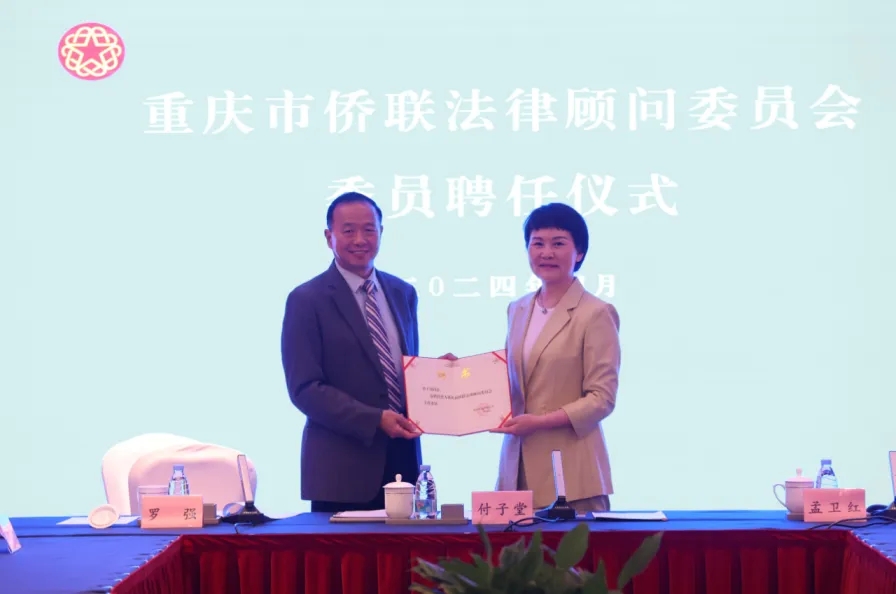为深入学习贯彻习近平总书记关于侨务工作和群团工作的重要论述,不断提升法顾委“服务大局、服务侨胞、服务侨联”工作质效,4月16日,重庆市侨联举行新一轮法顾委委员聘任仪式,向新聘任的委员代表颁发聘书。重庆市侨联党组书记、主席,市委统战部副部长孟卫红,市侨联法顾委新聘主任委员,市人大法制委员会主任委员付子堂出席仪式并讲话。