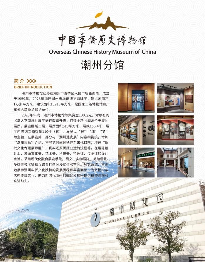 潮州市博物馆成立于1959年,2023年加挂潮州市华侨博物馆牌子,馆占地面积1万多平方米,建筑面积13215平方米,是国家二级博物馆和广东省古籍重点保护单位。2023年年底,潮州市博物馆筹集资金打造升级全新“潮州侨史展”展厅,展览区域二层,展厅面积510平方米,展线156.4米,展厅内陈列文物数量110件(套)。展览以“根”“魂”“梦”为主轴,采用现代化融合展览手段,图文、实物展陈、微缩场景、多媒体技术等相互结合打造沉浸式体验空间,系统、直观地展示潮州华侨文化独特的发展历程和丰富面貌,为弘扬中华优秀传统文化,助力新时代潮州的崛起和振兴提供精神食粮和奋进动力。作为中国华侨历史博物馆第二家分馆,潮州分馆将与中国华侨历史博物馆发挥总分馆跨地域跨管理系统共建共享的体系优势,共同挖掘潮州厚重的华侨历史文化资源,讲好华侨故事,弘扬华侨文化。