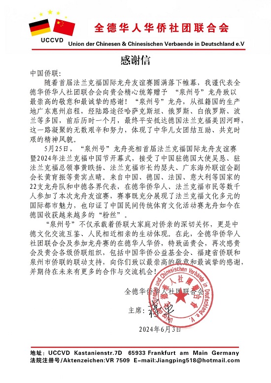 全德华人华侨社团联合会为此特地发来感谢信,向中国侨联、中国华侨公益基金会、福建省侨联、泉州市侨联的联动支持表示崇高的敬意和真挚的感谢。信中表示,“泉州号”龙舟的运抵体现了中华儿女团结互助、共克时艰的精神风貌,“泉州号”龙舟的亮相不仅承载着侨联大家庭对侨亲的深切关怀,更是中德文化交流互鉴、人民相近相亲的生动体现。