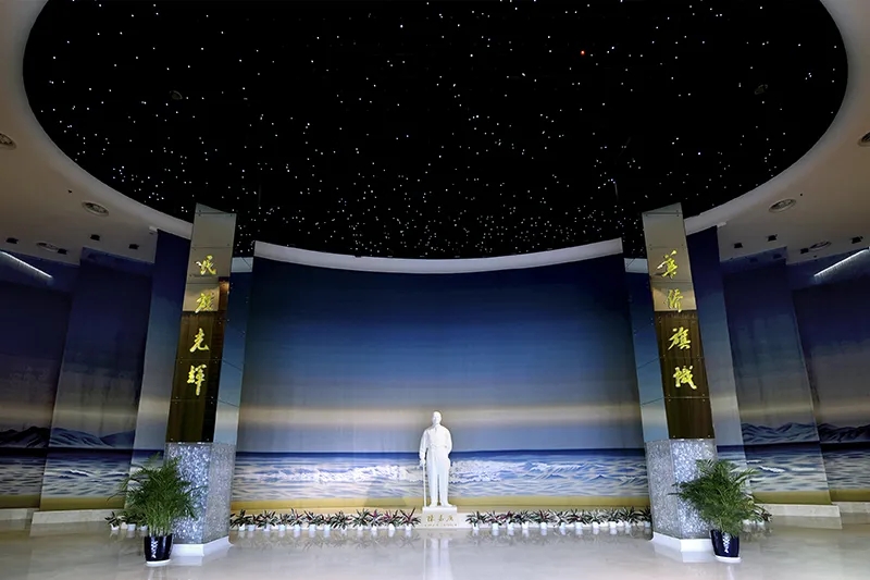 步入陈嘉庚纪念馆的序厅,抬头便可看到一片星空,这片星空是根据1874年陈嘉庚出生时的星空图仿制而成。那颗红色的星星,是被命名为“陈嘉庚星”的2963号小行星,象征着陈嘉庚的伟大业绩和崇高精神如恒星般,与天地共存,闪耀无尽光辉。