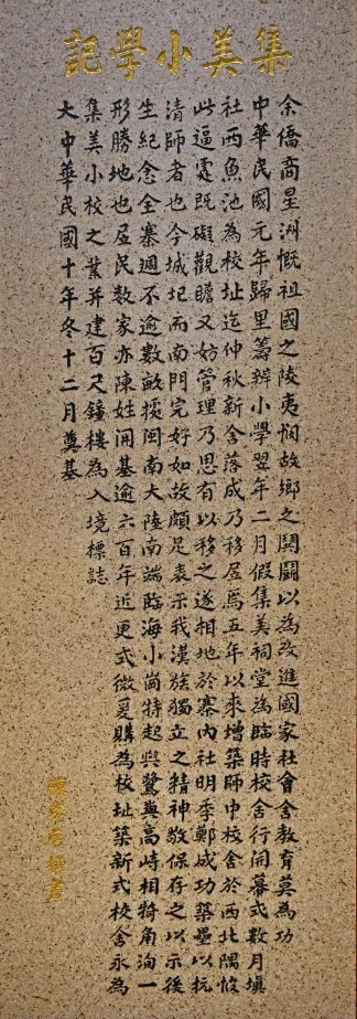 “教育为立国之本,兴学乃国民天职。教育不振则实业不兴,国民之生计日绌……”陈嘉庚纪念馆里悬挂的这些话语,是昔日陈嘉庚常提起的。1911年辛亥革命成功,陈嘉庚备受鼓舞,“思欲尽国民一分子之天职”。次年,他回到家乡。村中孩童衣不蔽体、成群失学、嬉游赌博的情景刺痛了他,更坚定了他兴学办校的信念。回乡第二年,陈嘉庚创办了集美小学。现在,纪念馆还保留着他当年写的集美小学记。