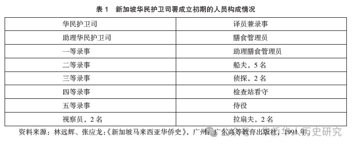 新加坡华民护卫司署的成立时间最早,职能最为完善,其早期人员构成如表1。