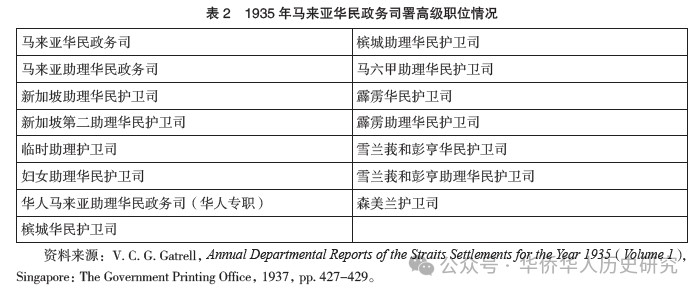 到1934年,各邦的华民护卫司署(华民政务司署)合并成马来亚华民政务司署,其职能有所扩大,高级职员岗位设置也相应有所调整。以1935年为例,其高级职位名单如下。