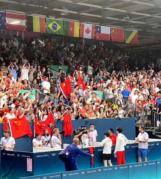 奥运赛程即将过半,关芬羡先生不仅现场见证了很多中国健儿的闪耀时刻,也亲历了中国健儿在巴黎的失误和遗憾,他说:“女子团体体操比赛中看到周雅琴从平衡木掉下去的那一刻,我的心揪了一下,而想不到现场竟然响起了一大片的欢呼声和热烈的掌声,我知道那不是鼓励的方式,同时也感受到小姑娘所面临的压力有多大,内心得有多强大才能稳得住。我们当时可以做的、想要做的,就是用中国话喊出加油,为他们打气!告诉他们‘即使在海外,还有华侨华人在你们身后!中国红在世界各个角落!’”