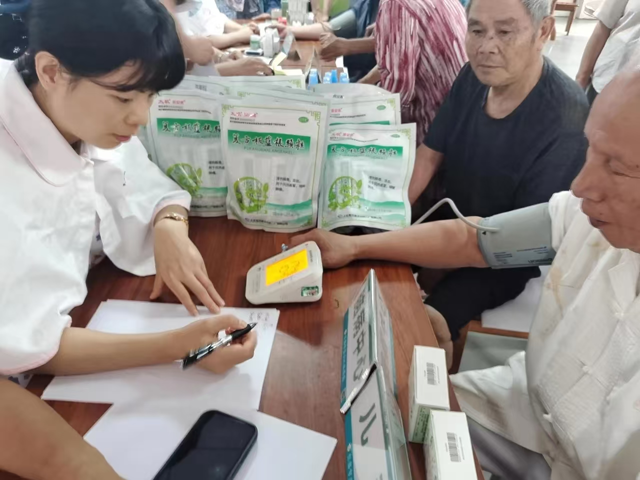 启动仪式后,由宜宾市第五人民医院和宜宾市中西医结合医院神经外科、检验科等科室专家组成的侨界医疗队,为归侨侨眷和人民群众免费测量血压、测量血糖、诊疗病情,耐心细致地提供治疗方案和健康指导。侨界医疗队专家还深入南溪街道养老服务中心卧病在床或行动不便的孤寡老人房中,提供诊疗及送药服务。当天共免费发放防暑、防蚊、消化、感冒等相关药品100余份、宣传册100余份。