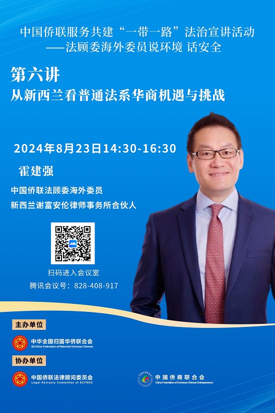 第六讲将于2024年8月23日(周五)14:30开播,由中国侨联法顾委海外委员新西兰霍建强律师主讲。霍建强律师毕业于中国政法大学、新西兰奥克兰大学,专长为信托、基金、投资、商法、IP知识产权商业化等,1994年移民新西兰,2008年当选新西兰国会议员,先后任新西兰国会财经委员会(第49届)常委、法制委员会(第50届)常委、商业委员会(第51届)常委以及法制委员会(第52届)主席,现为新西兰高等法院律师、新西兰谢富安伦律师事务所合伙人,曾出版《法之力——英美法系经典案例详解》《新西兰投资经商法律与税务——新西兰权威机构集体撰稿》《海外创出四重天》等著作。