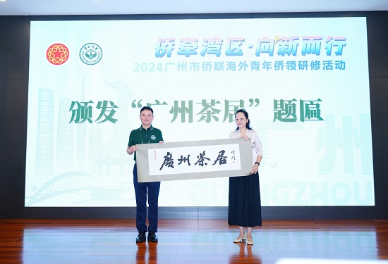 广州市委统战部副部长、市侨办主任江帆向海外侨领代表颁发”广州茶居“题匾。据悉,“广州茶居”题匾由广州书法家协会主席李鹏程挥毫题写。