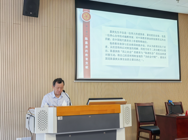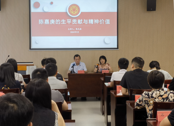 陈式海从“陈嘉庚的一生”“陈嘉庚的救国贡献”“陈嘉庚的教育贡献”“陈嘉庚在新中国成立后的贡献”“嘉庚精神的内涵”“嘉庚精神的时代价值”等六个方面,生动讲述嘉庚生平,通过一段段感人故事、一个个历史细节、一桩桩报国救民的光辉事迹,深情回顾了嘉庚先生艰苦创业、倾资兴学、赤诚爱国的伟大一生,向学员们传递了嘉庚先生“忠公、诚毅、勤俭、创新”的精神内涵。