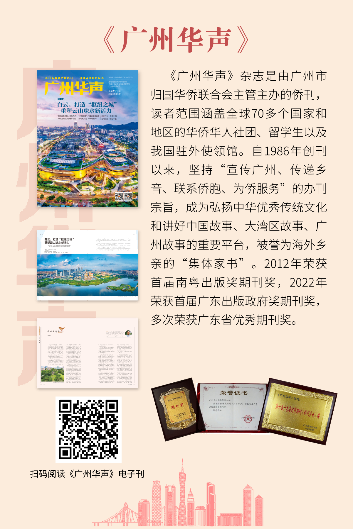 《广州华声》和《荣誉》两刊自2023年全面改版以来,紧跟时代步伐,精准把握侨界需求,通过精心策划与编排,紧密围绕侨乡发展的热点话题、大湾区建设的最新成就、侨史文化的深厚底蕴、侨联工作的动态进展、侨团活动的丰富多样以及侨胞个人的杰出成就等核心侨元素,构建了一个全方位、多角度的侨界信息传播体系。在内容呈现上,刊物坚持贴近侨界群众、贴近生活实际的原则,采用通俗易懂、亲切感人的语言风格,将大湾区侨界的故事娓娓道来,让每一位读者都能感受到来自家乡的温暖与力量。同时,通过深入挖掘广州市荣誉市民的创新创业故事,树立了一批可学可鉴的先进典型,激发了广大侨胞的爱国情怀与奋斗精神,激励更多侨胞投身到国家建设和家乡发展中来。先后荣获首届广东出版政府奖期刊奖、第六届广东省优秀期刊奖(侨刊乡讯)等多项殊荣,展现了新时代侨刊的独特魅力和崭新气象。