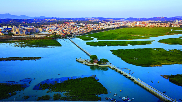 安平桥。是泉州与国家广阔的南部沿海地区的陆运节点,位于泉州城西南方向30公里的晋江安海镇与南安水头镇交界的海湾上,是泉州与其南侧的漳州、广州等地区联系的要道。因桥长五华里,俗称“五里桥”,为中国现存最长的跨海梁式石桥,素有“天下无桥长此桥”之美誉。安平桥的建成是泉州官方、宗教人士、商人及平民共同参与的结果,既体现了宋元时期泉州多元社会结构对海洋贸易的贡献,又反映了海洋贸易推动下泉州水陆转运系统的发展。