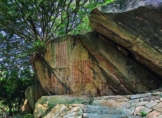 拾级而上,石刻如林,有些已被岁月湮没,有些则坚固如初。除了闻名遐迩的祈风石刻,还有题名的、游记的、赋诗的……石刻上的一字一句跃然纸上,清晰呈现出过往种种。西峰祈风石刻之上的“九日山”石刻,是全山最大的石刻。南宋理学家朱熹曾两游九日山,吟咏山川,探寻古迹,并书“九日山”三字,可惜年代久远,已淹没无存。清代擅写大字的福建提督马负书,因仰慕朱文公,于清乾隆三十三年(1738)重勒三字,以作纪念,这就是“九日山”石刻的由来。唐时,秦系客居泉州,与姜公辅结邻山间,在九日山上饮酒赋诗、评论古今,成为佳话,为纪念而建一秦君亭。石亭之下有一岩,叫“无等岩”,岩下刻有“泉南佛国”四字。唐时无等禅师游九日山后,筑石室倾心弘佛,曾在岩石上题“泉南佛国”。不论是山脚下的泉州最早的佛教寺庙延福寺,还是山顶的泉州最早的佛造像五代石佛,抑或是山间的南北朝时印度高僧拘那罗陀翻译梵文佛经《金刚经》所留下的翻经石,都佐证了九日山是泉州佛文化的最早聚集地之一。这就不难解释当时无等禅师为何在此写下“泉南佛国”四字了。在此山间,有历代文人墨客倾注笔墨,有名人贤士栖隐修身,有高僧禅师潜心弘佛。于山于水于景,或人或诗或文,巍巍山峦,悠悠岁月,都刻进石头里,每一次走进都能唤醒一段悠远的故事,穿越时空,直抵心扉。值得庆幸的是,正是这种坚不可摧的石头,才能守住千年记忆,守住璀璨文明。