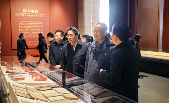 在讲解员的引导下,万立骏一行先后走进国家版本馆文兴楼、文华堂、文瀚阁、兰台洞库等,参观了“版本工艺”专题展、“斯文在兹——中华古代文明版本展”、“版本琳琅——中国当代出版精品与特色版本展”与“真理之光——马克思主义中国化时代化经典版本展”等专题展览陈列,认真聆听现场讲解,频频驻足陈列柜前,仔细阅览陈列展品,近距离领略典籍、版本凝聚的文化血脉和寄托的民族理想,深刻体悟到版本背后强大的文化生命力、文化感召力,感受马克思主义中国化时代化的光辉历程,真切感受到中华文化的深厚底蕴和中华文脉的时代价值。在参观过程中,大家不时为中华民族博大精深的文化而感慨赞叹。