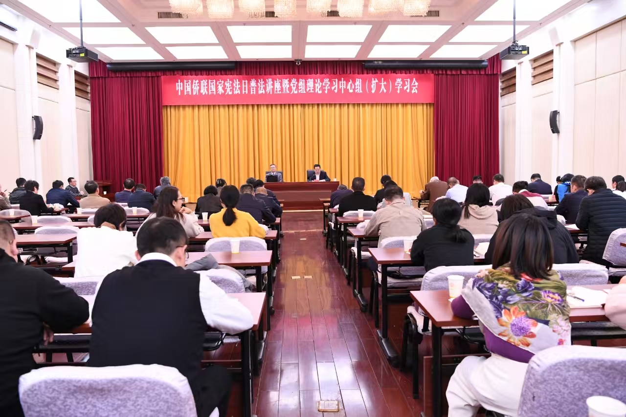 今年12月4日是第十一个国家宪法日。为全面贯彻党的二十大和二十届三中全会精神,深入学习宣传贯彻习近平法治思想和习近平总书记在第十个国家宪法日之际作出的重要指示精神,推动“八五”普法规划目标任务全面落实,4日下午,举办“国家宪法日”普法讲座暨党组理论学习中心组(扩大)学习会。法顾委委员、全国“八五”普法讲师团成员、中国人民大学教授莫于川以《坚持依宪治国,加强涉侨法治——学习贯彻二十大和二十届三中全会精神》为题进行授课。党组成员、副主席程学源、连小敏出席会议。