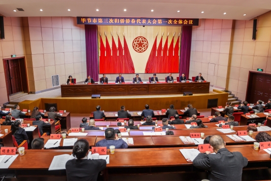 毕节市妇联党组书记、主席张树洁代表人民团体致贺词。毕节市侨联二届委员会主席张友代表毕节市侨联二届委员会向大会作了题为《坚定不移沿着习近平总书记指引方向奋勇前进 团结凝聚全市广大归侨侨眷和海外侨胞 为建设贯彻新发展理念示范区作出侨界新贡献》的工作报告。