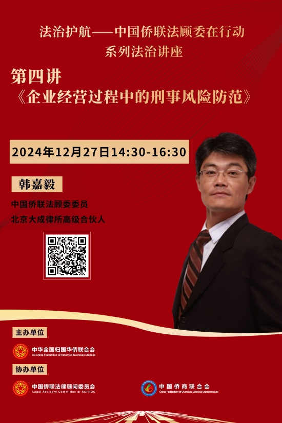 为深入学习贯彻党的二十大精神,全面落实第十一次全国归侨侨眷代表大会工作部署,进一步发挥法顾委专业委员会作用,为侨胞侨企提供前置法律服务,帮助防范经营风险,由主办,法顾委、中国侨商联合会协办的“法治护航——法顾委在行动”线上系列法治讲座于4月26日正式启动。