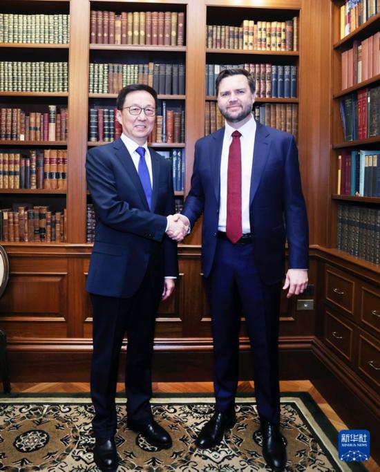 当地时间1月20日,习近平主席特别代表、国家副主席韩正应邀在华盛顿出席美国总统特朗普就职典礼。在美期间,韩正同当选副总统万斯举行会见。新华社记者 刘卫兵 摄