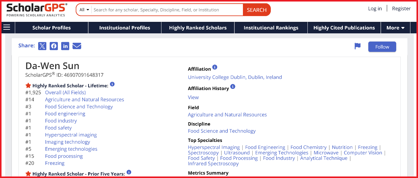 近日,国际学术排名机构ScholarGPS发布了2024年全球前0.05%顶尖科学家榜单。榜单显示,以“终身”为统计周期,在“食品工程”“食品工业”“食品安全”“高光谱成像”和“成像技术”5个领域中,欧洲科学院院士、爱尔兰皇家科学院院士、华南理工大学现代食品工程研究中心主任孙大文教授均名列榜首。此外,在“食品科学与技术”这一综合性学科的全球排名中,孙大文院士也进入了前三位。