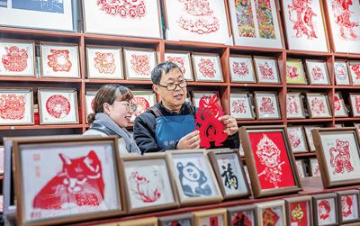安徽淮北市濉溪县古城,剪纸非遗代表性传承人在介绍剪纸技艺。