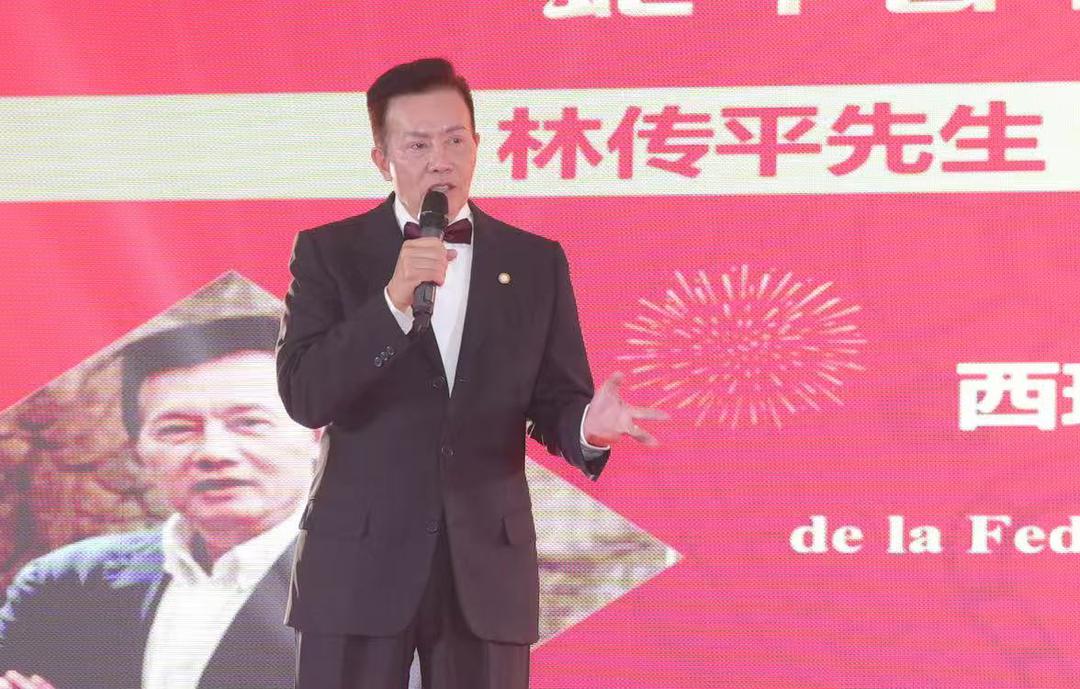 社团联谊总会林传平主席致欢迎词。他回顾了14年前开始从事慈善公益事业的缘由,当时正值世界金融危机,社团联谊总会与时任加区主席号召中国企业到当地投资,助力加区经济回复。自那时起,通过“慈善”这一平台,加区侨领侨胞在每年年初都与中央政府代表、加区主席、议会主席、政党代表等西班牙各级政要及当地的司法、高校、商会共庆中国农历新年,一起吃团圆饭。由此演变而来的春节慈善晚宴逐渐发展成为一个促进中西交流合作,展示华人正面形象,展现中国现代化建设的窗口。