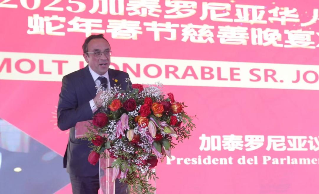 加泰罗尼亚议会主席Josep Rull致辞时,感谢社团联谊总会主席林传平通过自己对中国和加区的熟悉与了解,助力两地建立友好关系所起的积极作用。