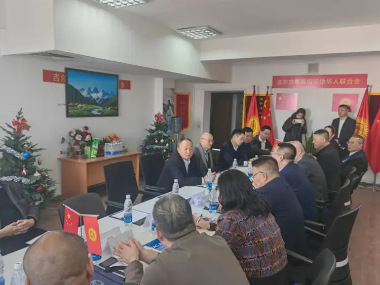 2025年3月14日上午,中国民主建国会烟台市委会对外联络委员会中亚考察团一行十余人,在民建烟台市委委员李杰和外联委主任朱有长的率领下,来到吉尔吉斯斯坦华侨华人联合会,与联合会领导班子成员亲切会面,商讨在中吉投资经贸事宜。