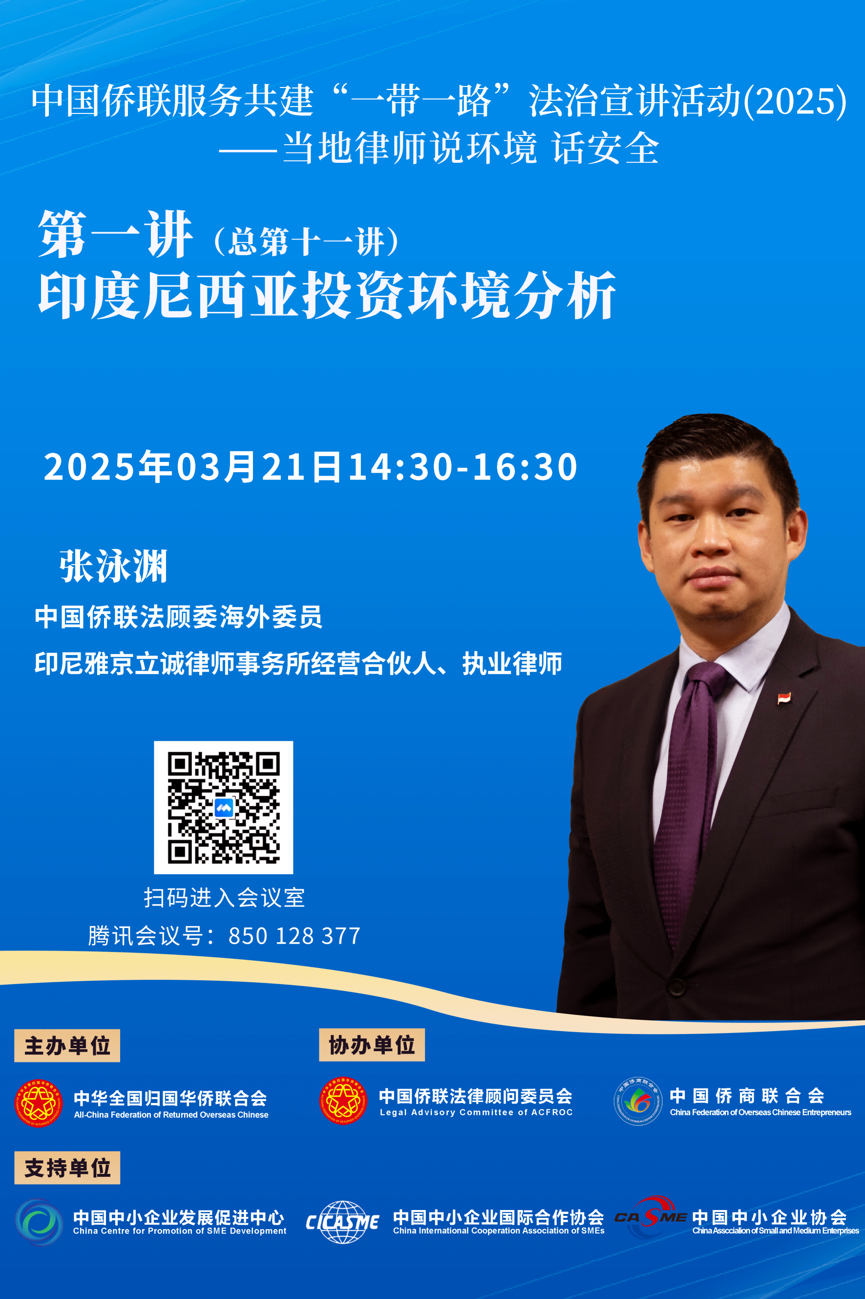 今年第一讲(总第十一讲)将于2025年3月21日(周五)14:30开播,由法顾委海外委员印度尼西亚张泳渊律师主讲。张泳渊律师是印尼第四代华人,祖籍福建龙岩,先后毕业于印尼Azzahra大学和Pelita Harapan大学,专长为民事、刑事、能矿资源、不正当竞争及反垄断、金融、卫生、会计等,是印尼雅加达雅京立诚律师事务所经营合伙人、执业律师。2019年至2023年,张律师带领雅京立诚律所连续五年进入印尼全国 100大律所排行榜。张律师长期为在印尼的中资企业和中国公民提供法律咨询和帮助,并致力于促进印尼与中国的法学交流。张律师于2018年受聘为法顾委海外委员,于2019年担任印尼就业法典的备案审查专家,于2021年担任印尼金属和煤炭矿业法操作细则的备案审查专家,同时担任印尼律师协会维护律师权益部副部长、印尼能矿律师协会律师维权权益部长。