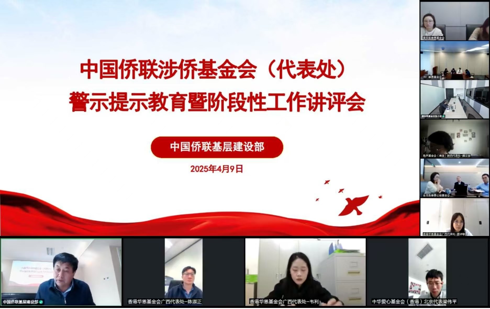 4月9日下午,基层建设部召开涉侨基金会(代表处)警示提示教育暨阶段性工作讲评视频会议,进一步加强对业务主管的10家涉侨基金会(代表处)的政治引领和业务工作指导,解决工作问题,传导工作压力,压实工作责任,传递严的基调,营造依法行善治善的氛围。作为业务主管单位的10家涉侨基金会(代表处)的负责人和工作人员共30余人参加会议。
