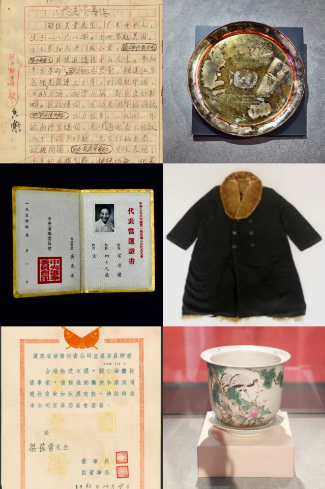 本次展览共展出来自30家单位逾200件(套)藏品,其中,入选“共和国印记”见证物的6件江门五邑地区的见证物首次集中展出,分别是:中央人民政府华侨事务委员会主任何香凝亲笔修改的司徒美堂墓志铭初稿,留学归国学者雷洁琼第一届全国人民代表大会代表当选证书,广东省华侨投资公司宣募委员、加拿大侨胞梁葆常聘书,新中国首任联合国副秘书长、美国归侨唐明照1979年离任联合国副秘书长时的纪念银盘,著名爱国侨领司徒美堂1949年回国后周恩来总理赠予的大衣,周恩来总理1958年送给印尼归侨关崇涧的花盆。