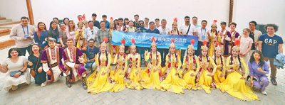 交流营成员在库车市体验新疆民俗文化并合影留念。 本报记者 李欣怡摄 |