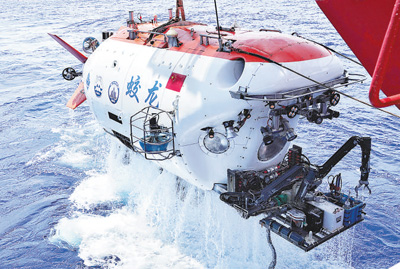 “蛟龙”号在西太平洋海域完成下潜出水。 新华社记者 王聿昊摄 |