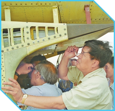1997年,歼—10原型机01架发动机首次试车后,宋文骢(左)、杨宝树在查看进气道。 李 勇摄 |