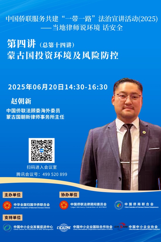 今年第四讲(总第十四讲)将于2025年6月20日(周五)14:30开播,由法顾委海外委员蒙古国赵朝新律师主讲。赵朝新律师1991年出生于蒙古国乌兰巴托市,2013年毕业于中国暨南大学法学院,后在蒙古国国家行政管理学院进修政府法务管理,是蒙古国目前唯一一位获得律师资格证的中国公民。赵律师曾担任蒙古国中国和平统一促进会、蒙古国浙江商会和多家中资企业的法律顾问,2021年创立了蒙古国朝新律师事务所。该律所是蒙古国目前唯一一家由中国公民100%持股、具有从事蒙古国相关法律业务资格的本土律师事务所,为在蒙古国的中国公民和从事矿业、生产业、建筑业、销售业、金融业等领域的中资企业提供专业、优质的法律服务。