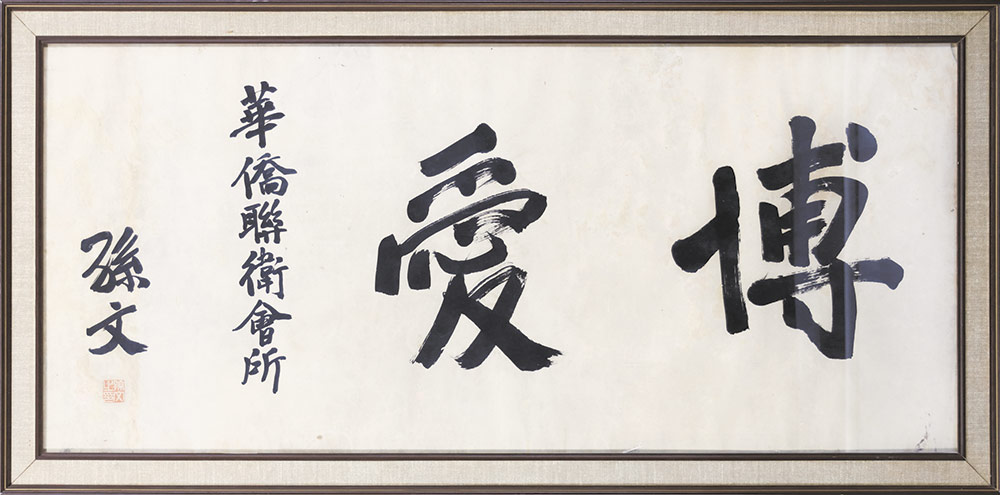 中国华侨历史博物馆收藏的是孙中山先生为南非杜省(即杜兰斯畦省)华侨联卫会题写的“博爱”。这是现存唯一由孙中山亲笔题写,并且在落款上明示赠予华侨团体的一幅书法作品。题识书孙文二字,钤印为白文孙文之印。此幅孙中山先生题写的“博爱”用纸为普通白纸,长103.7厘米,宽50.5厘米,已泛黄,多处虫蛀,后经重新装裱修复,但镜框仍是当年镶制的,油漆已现斑驳。从书法角度来看,该题词以唐楷为本,风格端庄质朴,气息淳厚隽永,笔画圆融含蓄。