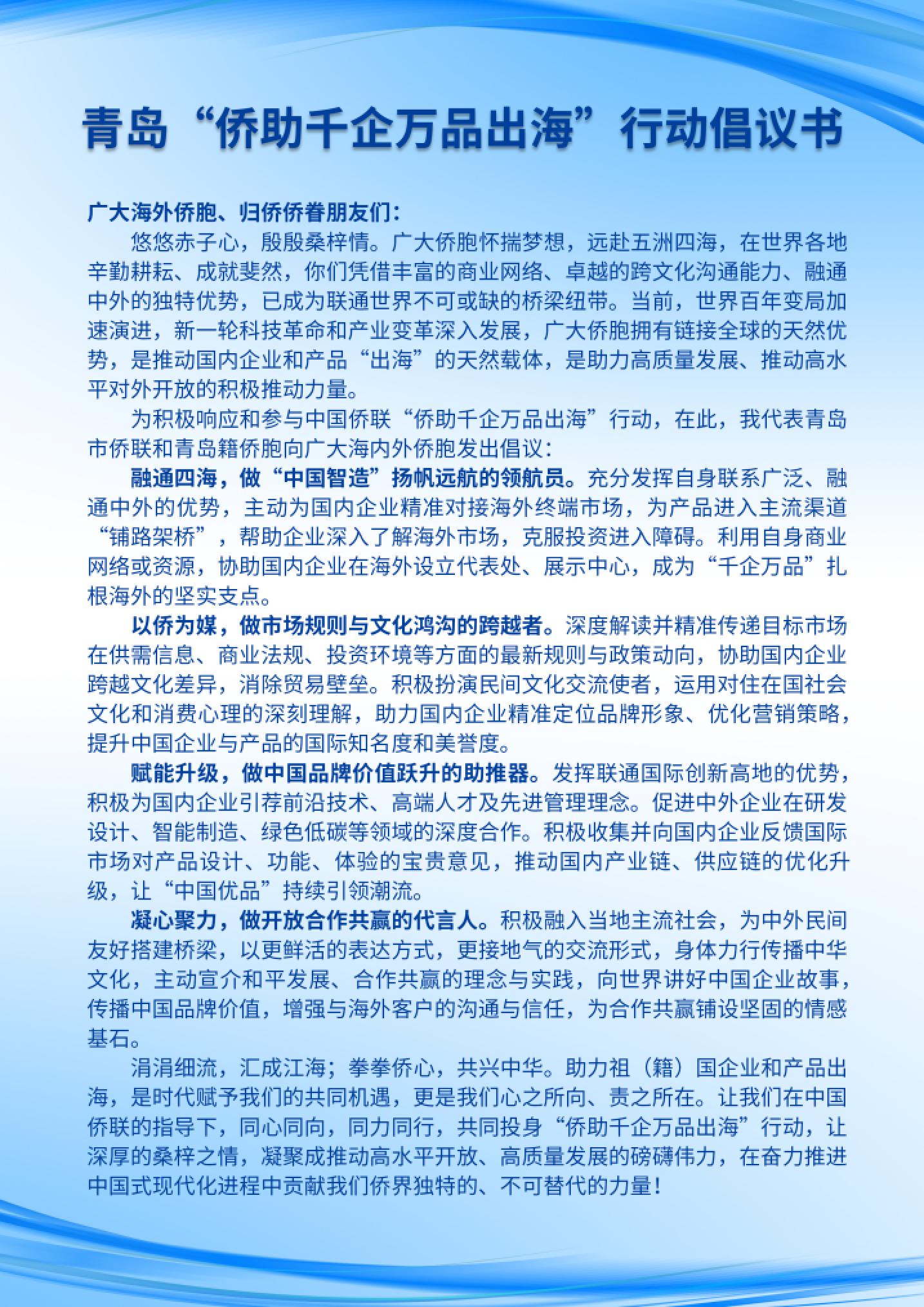 程红、李兴钰等与会领导和侨界企业家代表共同启动青岛“侨助千企万品出海”行动,标志着青岛将深度参与由发起的这一全国性行动,利用侨界资源网络,助力本地企业和产品“走出去”。会上,宣读了《青岛“侨助千企万品出海”行动倡议书》,该倡议立足国家开放发展大局,从“融通四海,做‘中国智造’扬帆远航的领航员”;“以侨为媒,做市场规则与文化鸿沟的跨越者”;“赋能升级,做中国品牌价值跃升的助推器”;“凝心聚力,做开放合作共赢的代言人”等四个方面,向广大华侨华人发出携手开拓企业和产品出海新境界的号召。
