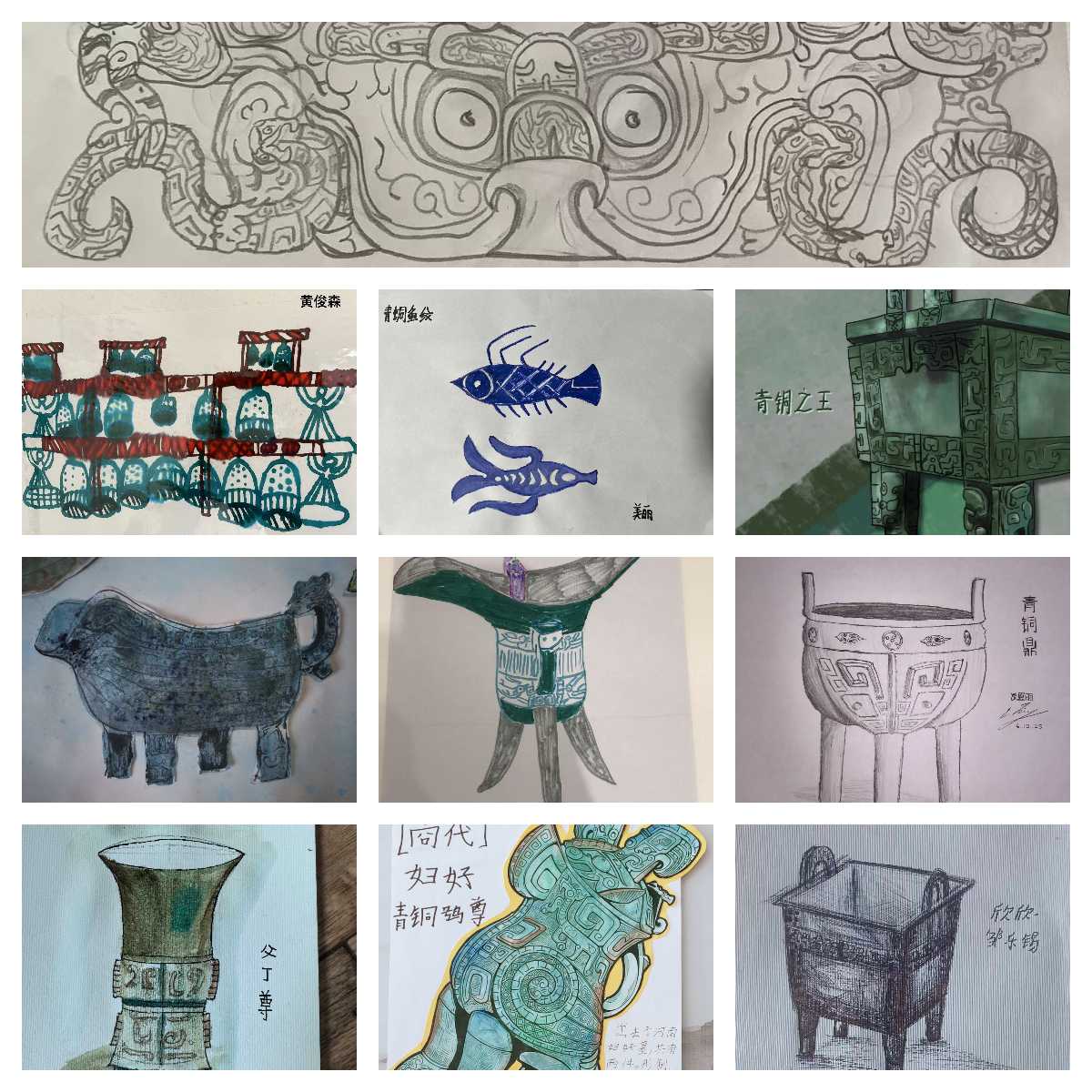 作为“商都”的代表性符号,商代青铜器在营员笔下焕发光彩。他们凭借精湛画艺,令妇好鸮尊、后母戊鼎、编钟等器具跃然纸上,更以细腻工笔,精妙再现了青铜鱼纹、饕餮纹等纹饰的韵味。