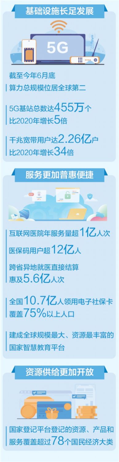 公共服务更加普惠便捷。智慧医疗服务扩面提速,全国互联网医院年服务量超过1亿人次,全国医保码用户超过12亿人,跨省异地就医直接结算惠及5.6亿人次。数字教育扩容升级,我国已建成全球规模最大、资源最丰富的国家智慧教育平台。数字社保扩围增效,全国10.7亿人领用电子社保卡,覆盖75%以上人口,长三角、成渝等城市群逐步实现“一卡通”区域服务互联互通。数字养老服务取得积极成效,全国养老服务信息平台上线,促进养老服务资源供需高效对接。