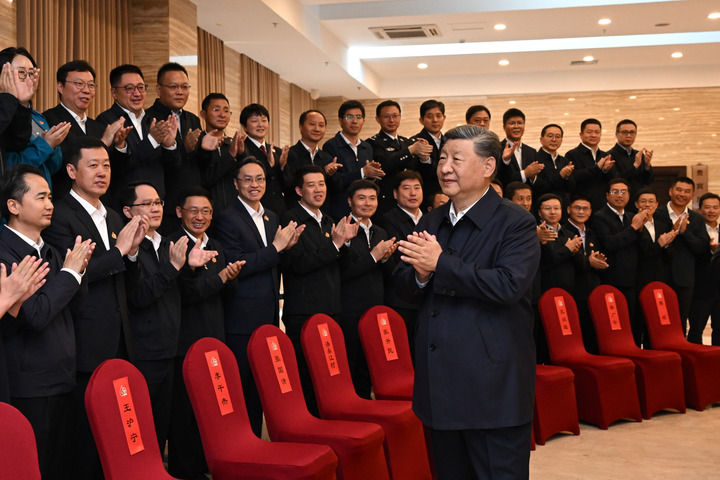习近平等来到接见现场时,全场响起长时间热烈掌声。习近平向大家挥手致意,不时同代表亲切交流,并同大家合影留念。